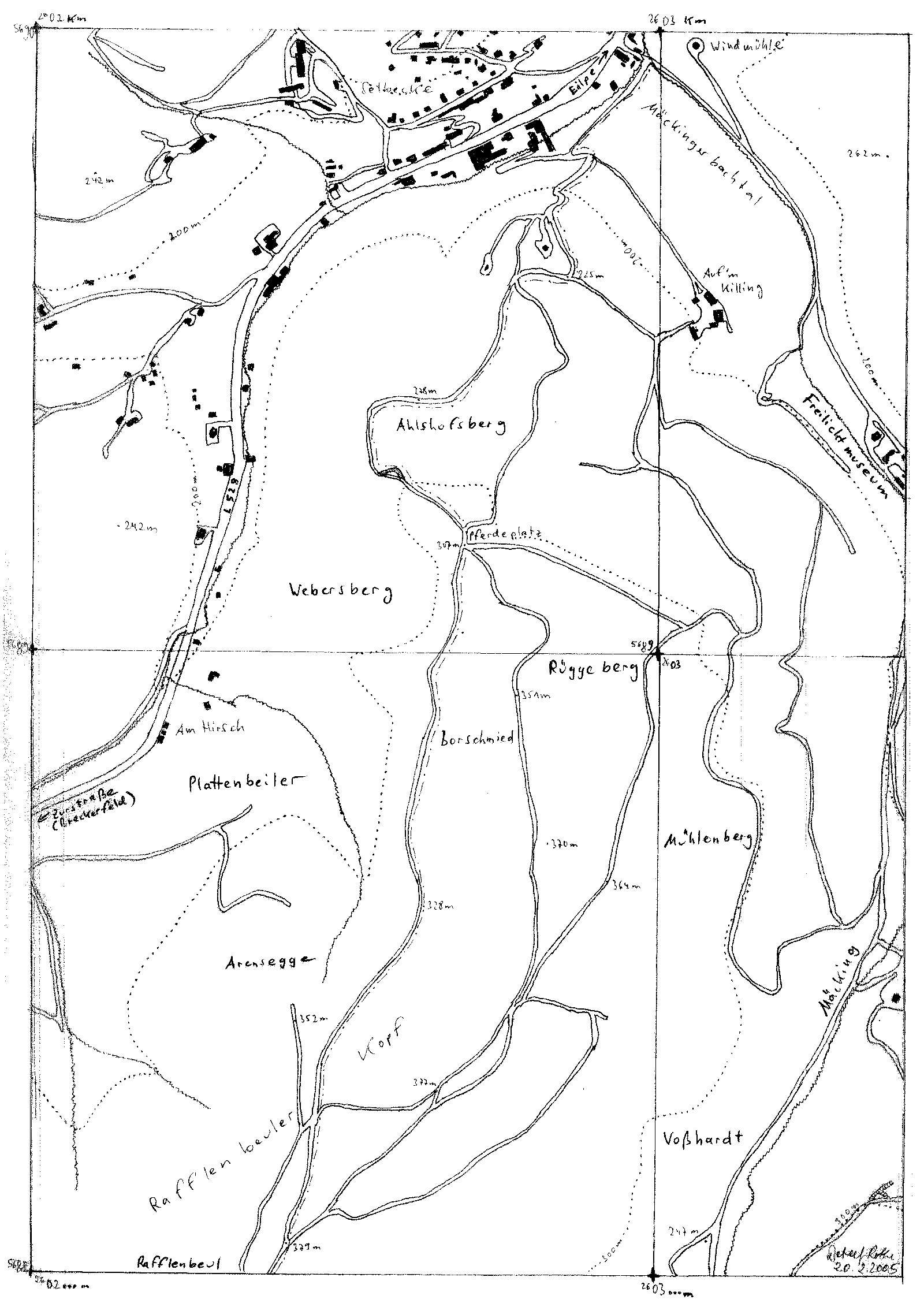 Am Freitag (,den 25.4.,) habe ich mit "meiner" Schulklasse [U II b des Fichte-Gymnasiums Hagen] eine Wanderung nach Zurstraße gemacht, wo wir Fußball gespielt haben. Anschließend, gegen Mittag, haben wir uns aufgelöst. Ich bin über den Mühlenberg [richtig: Rafflenbeuler Kopf