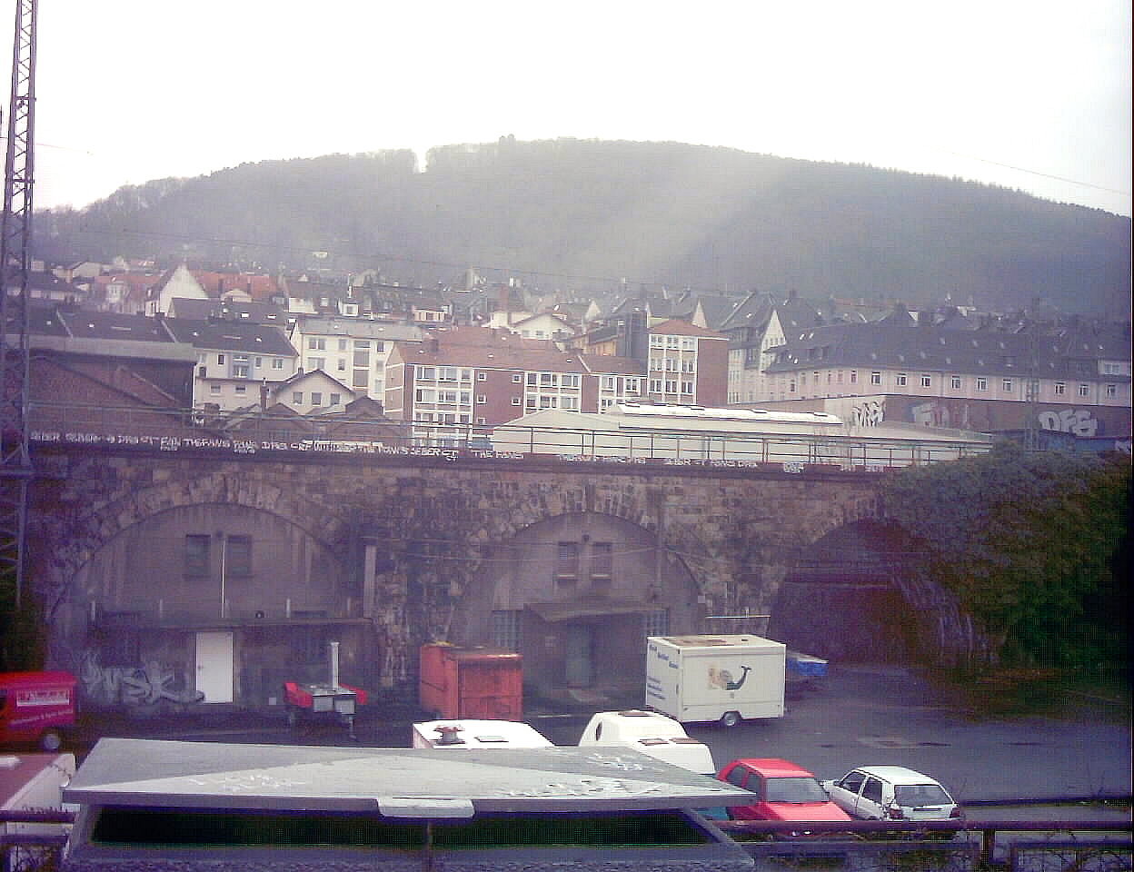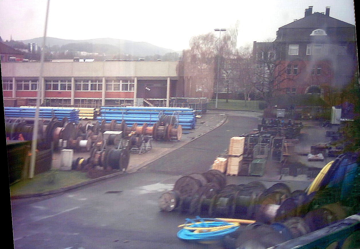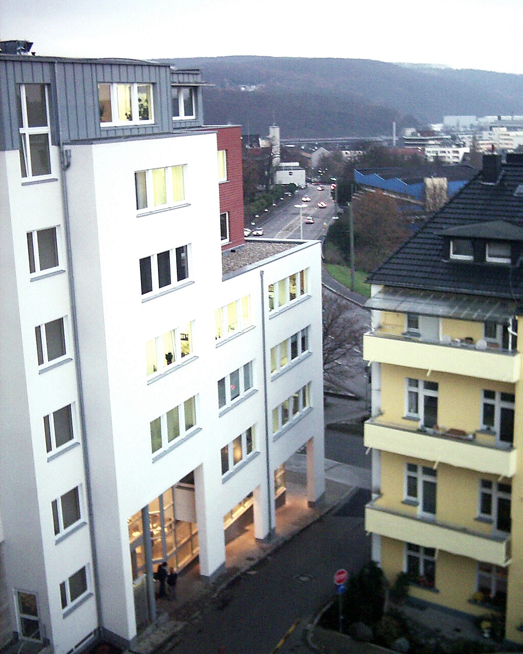 Der Blick von den oberen Klinik-Etagen nordwestwärts fällt auf die Feuerwache an der Einmündung der Lange Straße: