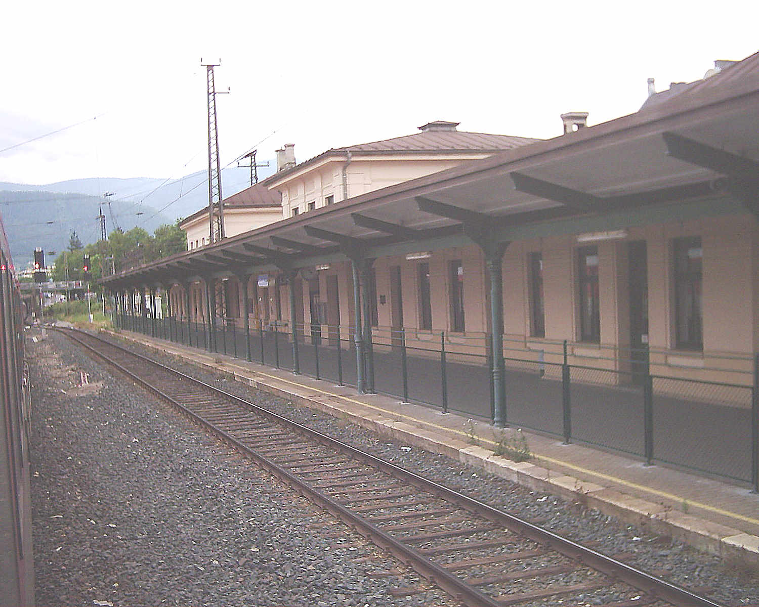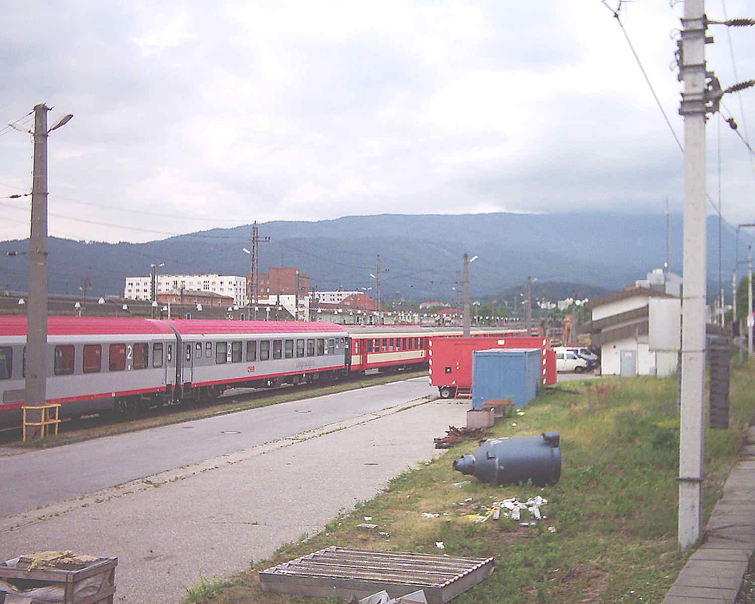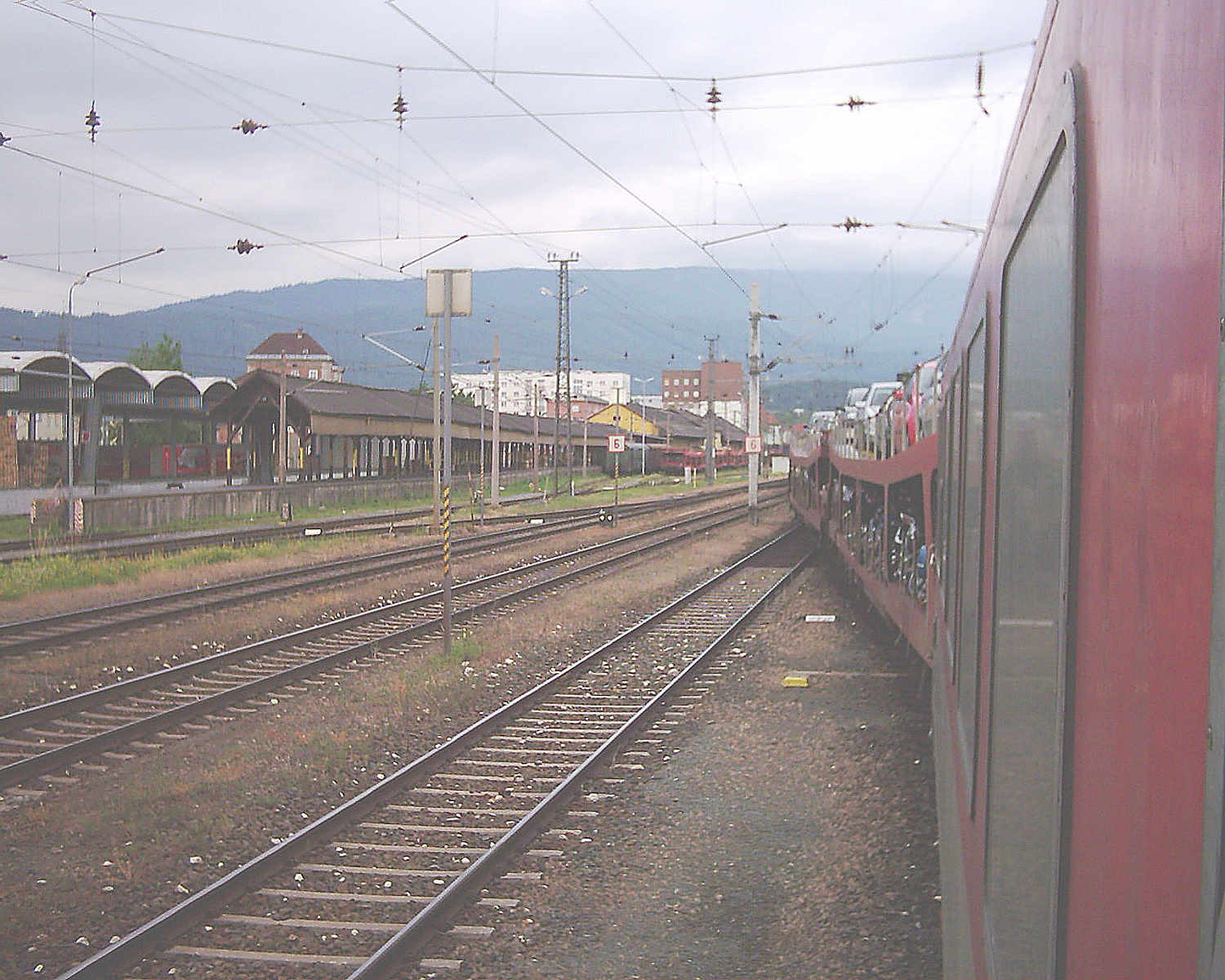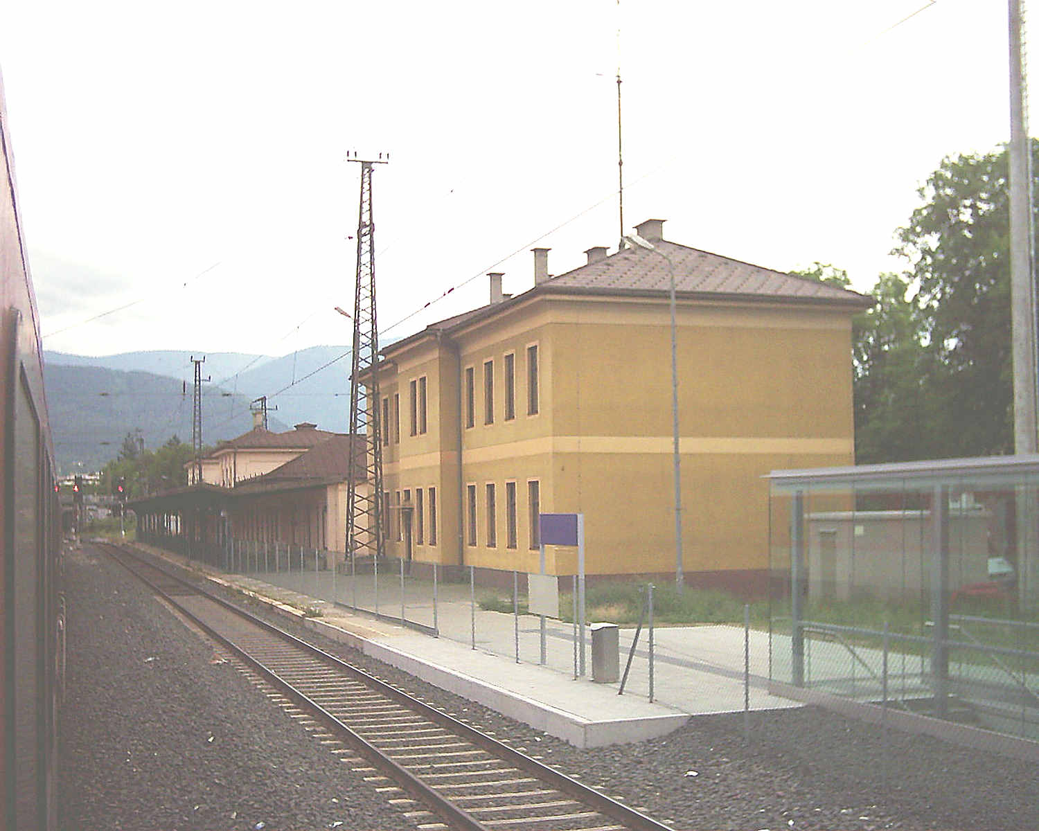 Wir sind in Villach (meine Mutter und ich), haben Aufenthalt. Habe eine relativ ruhige Nacht verbracht - mit Ohrstöpseln. Das Abteil war nicht voll besetzt, also angenehme Ruhe. Der Zug blieb fast pünktlich (ca. 5 Minuten Verspätung), [und es war] insgesamt wesentlich angenehmer als auf der letzten Hinfahrt im Juni. Leider ist es kalt, neblig, und in Villach nieselt es kaum sichtbar. Ich bin gespannt, wie es hinter dem Karawankentunnel in Jesenice aussieht. 9:50"