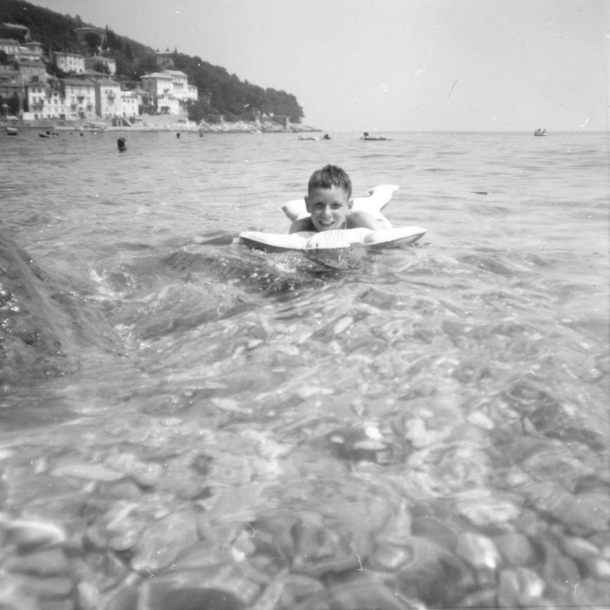 Verfasser beim Baden in der Adria am Hauptstrand (mit Gummischildkröte als Schwimmtier)