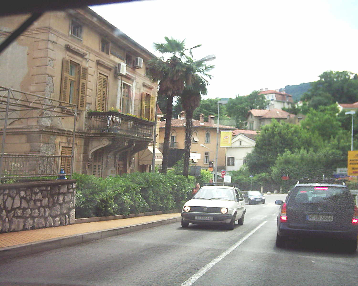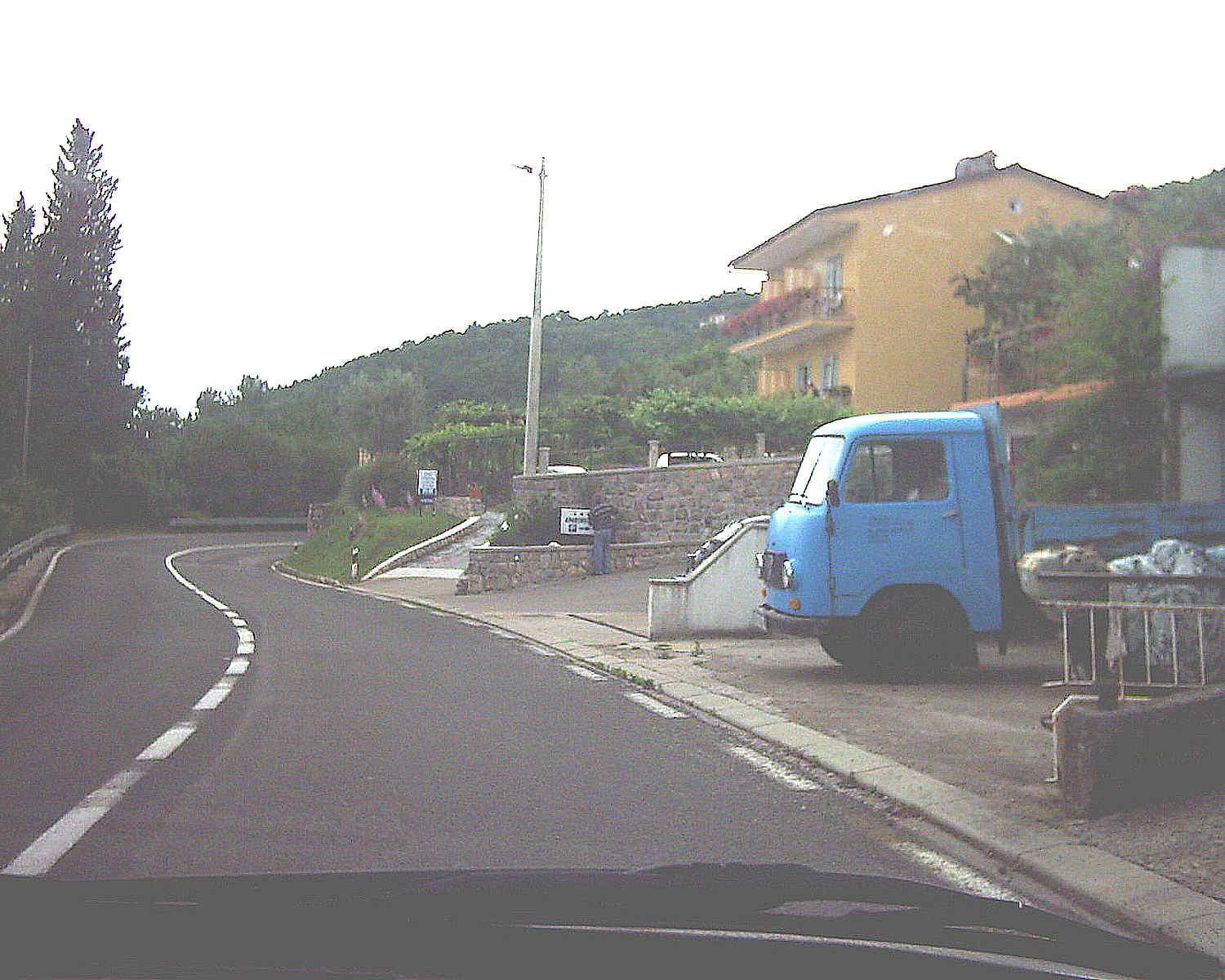 Wenige Tage nach der Ankunft in Mošćenička Draga - während des Urlaubs in der Hauptferienzeit 1973 - kam es zu einem noch recht glimpflich verlaufenden Unfall auf dem Wege zu einem nachmittäglichen Kaffeetrinken in Opatija: Bei einsetzendem Regen verwandelte sich der Ölfilm auf der vielbefahrenen, mit Kieseln geteerten Straße in Schmierseife, und der schwere Opel Rekord meines Vaters rutschte (wohl zwischen Kraj und Medveja) bei vierzig Stundenkilometern in den Abgrund. Die vereinzelten Sicherungssteine am bordsteinlosen Straßenrand waren längst ,abrasiert':