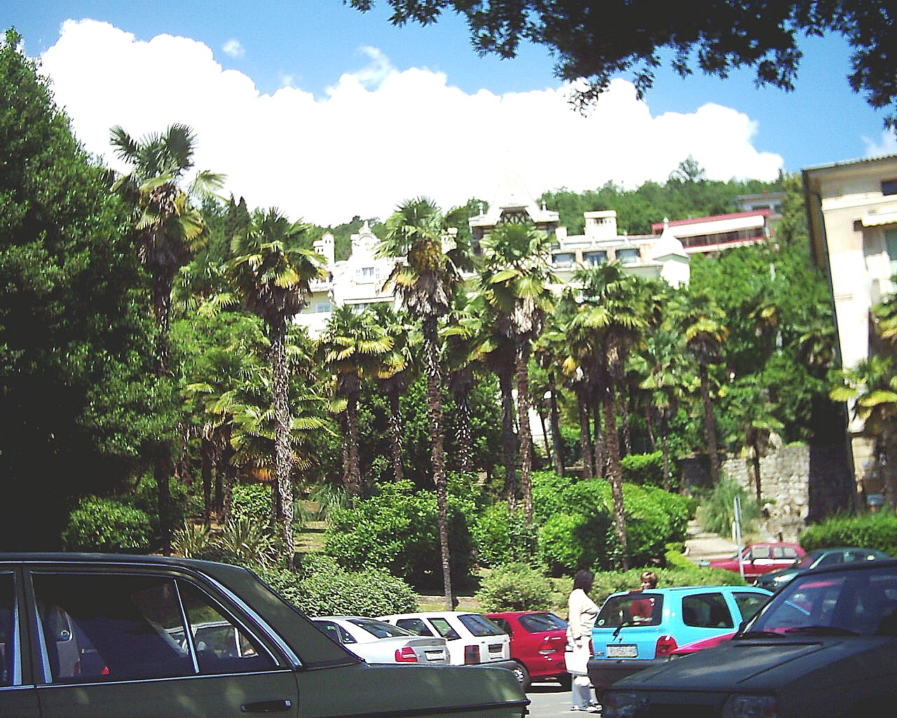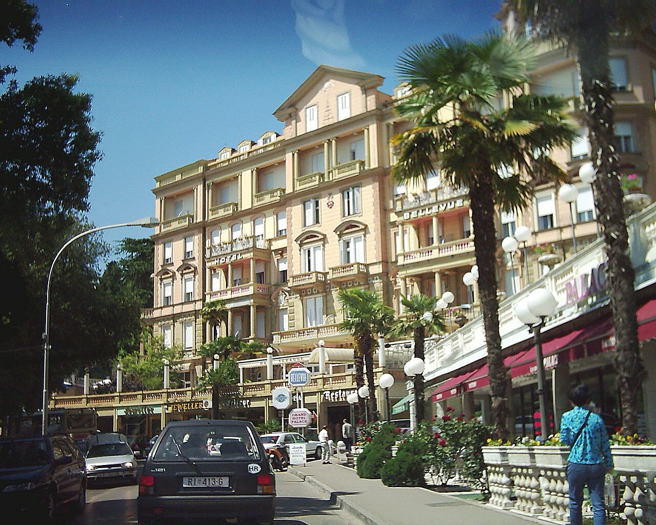 Das Grand Hotel Palace-Bellevue (07.06.2004 11:13 Uhr). Zum Vergleich das Hotel-Panorama am Slatina-Kai um 1910: ganz links Kristal, weiter vorne Residenz und ganz rechts Bellevue (heute alle den Liburnia Riviera Hotels angehörend):