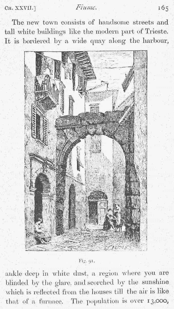 „The view from the harbour at Fiume in the afternoon is delightful, the mass of Monte Syss on Cherso [= Insel Cres] guarding the entrance of the Quarnero [= Kvarner] on one side, while the many spurs of the Monte Maggiore [= Vojak] range on the other troop to the sea, blue in the shadow, and paling and lowering with greater distance."