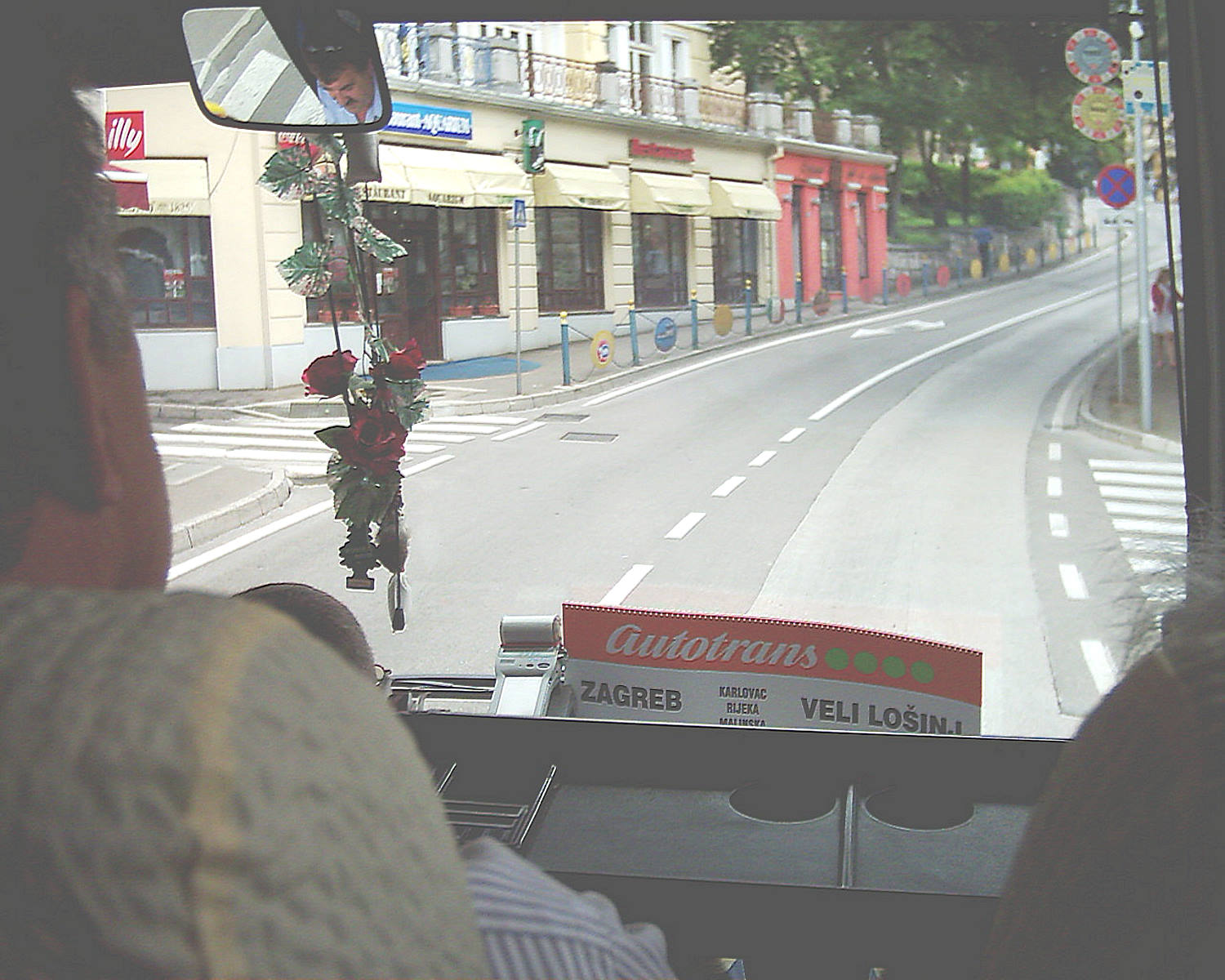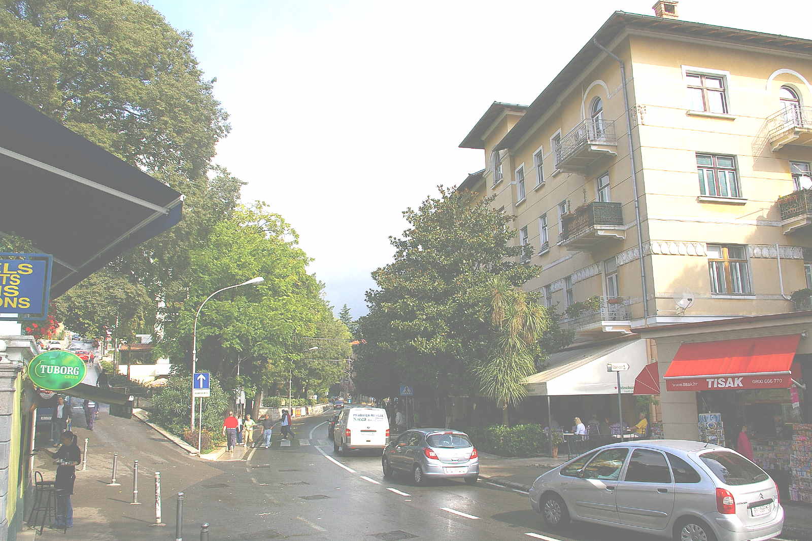 11:40 Nach einem unergiebigen Stadtrundgang mit Anlauf zweier Tourist Offices jetzt in einem Kiosk fündig geworden, was eine Regionalkarte angeht. Leider ist die Ausführlichkeit sehr schlecht, insbesondere was die City von Lovran angeht; daher behelfe ich mich mit einem kopierten Plan mit Hinweis auf eine Buchhandlung, welchen ich im Tourist Bureau am Hafen erhalten habe. Nach zahlreichen [Stereo-]Fotos mache ich mich jetzt auf den Weg zu eben dieser Buchhandlung, zumal es in Lovran offenbar kein Museum gibt. [...] Der Straßenlärm hier ist enorm. 11:43