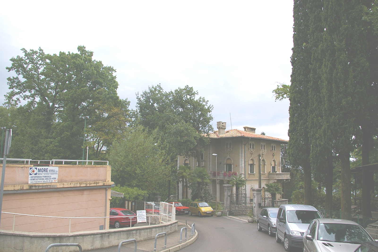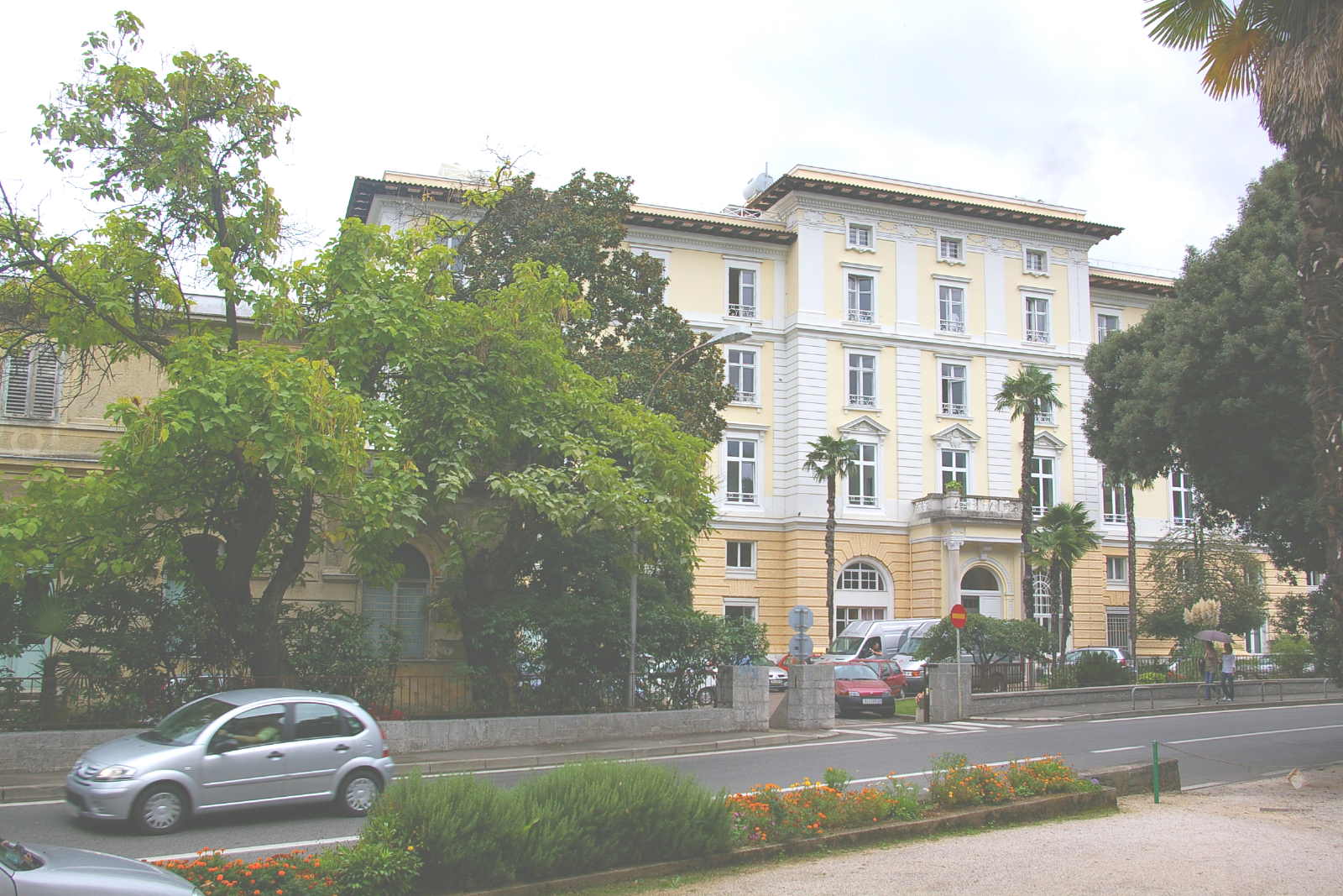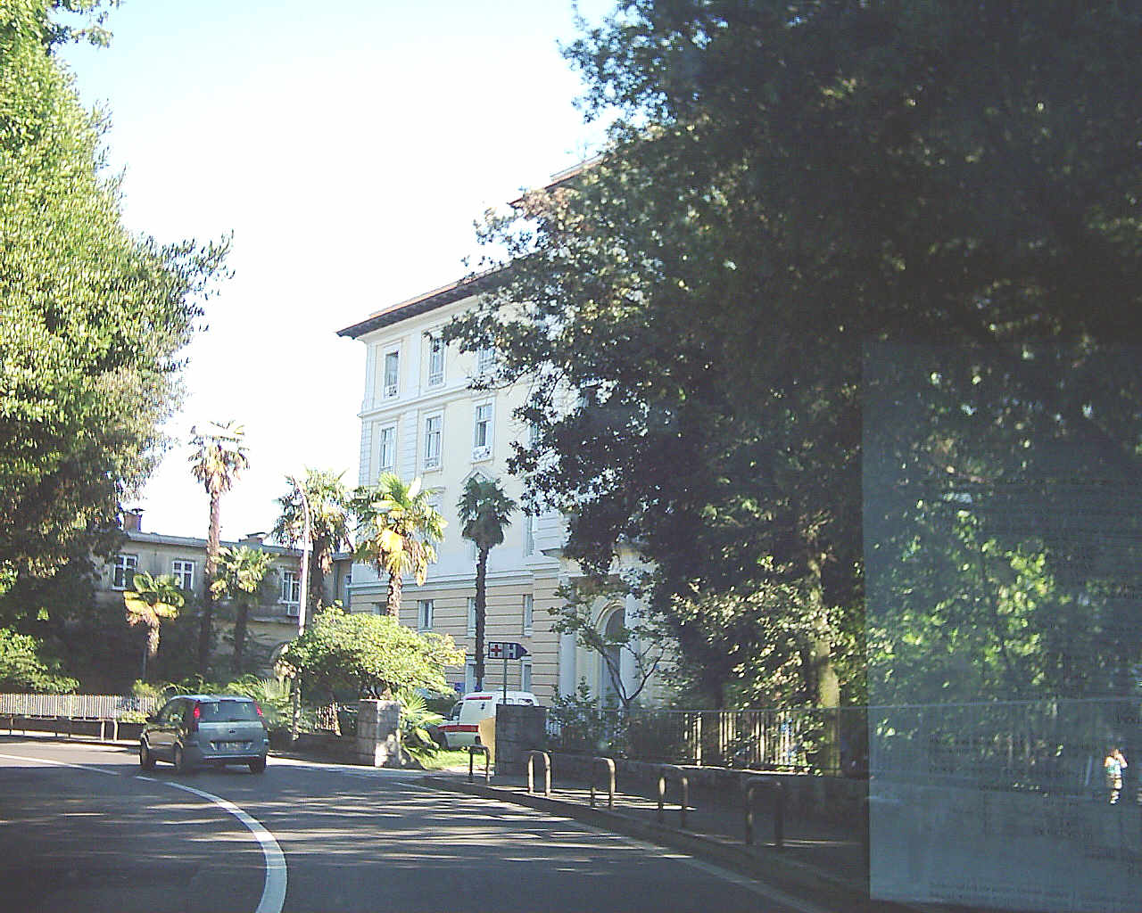 12:19 Uhr: Blick von der Badeanstalt bei der Klinik am ,Nordstrand' auf die Bucht von Rijeka 13:05 Uhr: Eingangsbereich der Orthopädischen Klinik von der Hauptstraße aus 13:07 Uhr: Altbauten an der Hauptstraße gegenüber der Klinik