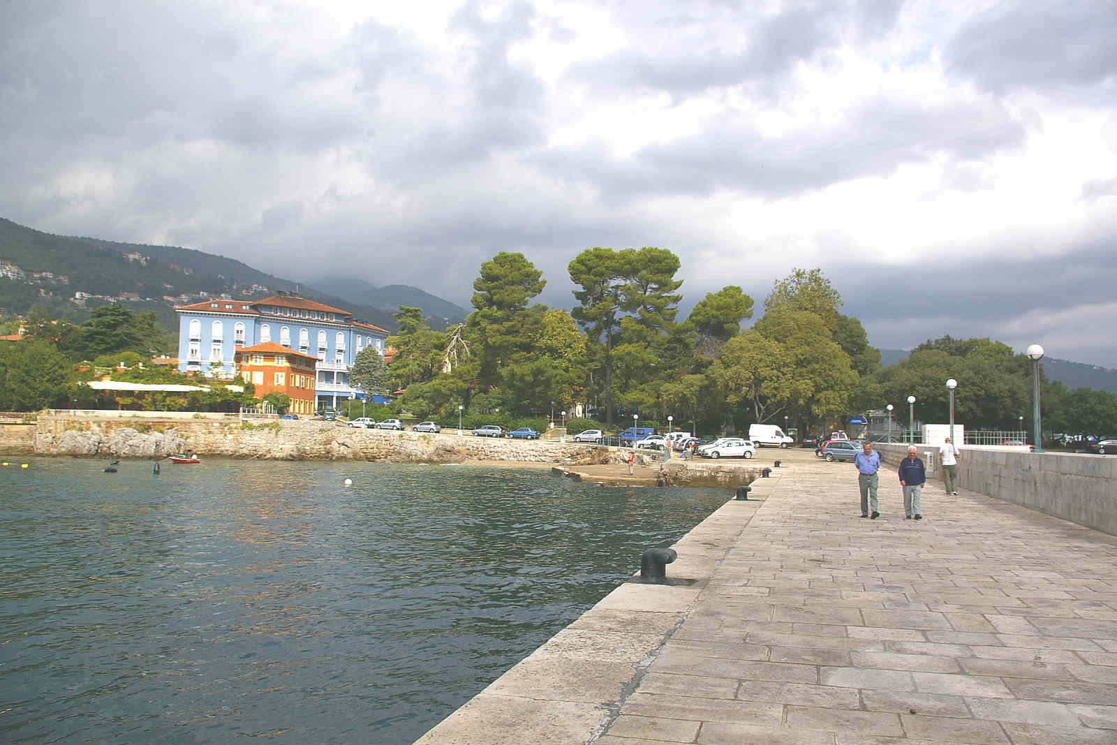 10:56 Uhr: Blick vom Alten Hafen auf Rijeka 10:56 Uhr: Blick entlang der Hafenfront der Altstadt von Lovran gen Norden 10:58 Uhr: Blick entlang von Hotel Park gen Neuer Hafen und ,Südstrand' (vergleiche zum 7.6.2004, 11:29 Uhr) 11:00 Uhr: Blick vom Neuen Hafen zum ,Südstrand', dem südlichen Abschnitt der Küste bei Lovran 11:00 Uhr: Blick vom Neuen Hafen zurück zum Hotel Park; davor befindet sich ein als Carno Café Adria alias Grand Café Adria bekanntes Bauwerk, welches früher als das Hotel errichtet wurde und dessen heutige Funktion mir derzeit unbekannt ist (bis mindestens 2010 war es mit Reklame verdeckt) - hier zum Vergleich die Ansicht einer Postkarte aus dem 1920er Jahrzehnt: