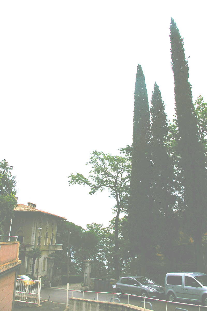 13:18 Ich habe eine Fototour vom Krankenhaus bis zum hinteren Ende des Villenviertels (Villa Magnolia) gemacht; die letzte Villa konnte ich wegen einer hohen Mauer nicht ablichten; jetzt geht es auf dem Weg dahinter hinunter zum Lungomare. Es beginnt wieder zu regnen. 13:19