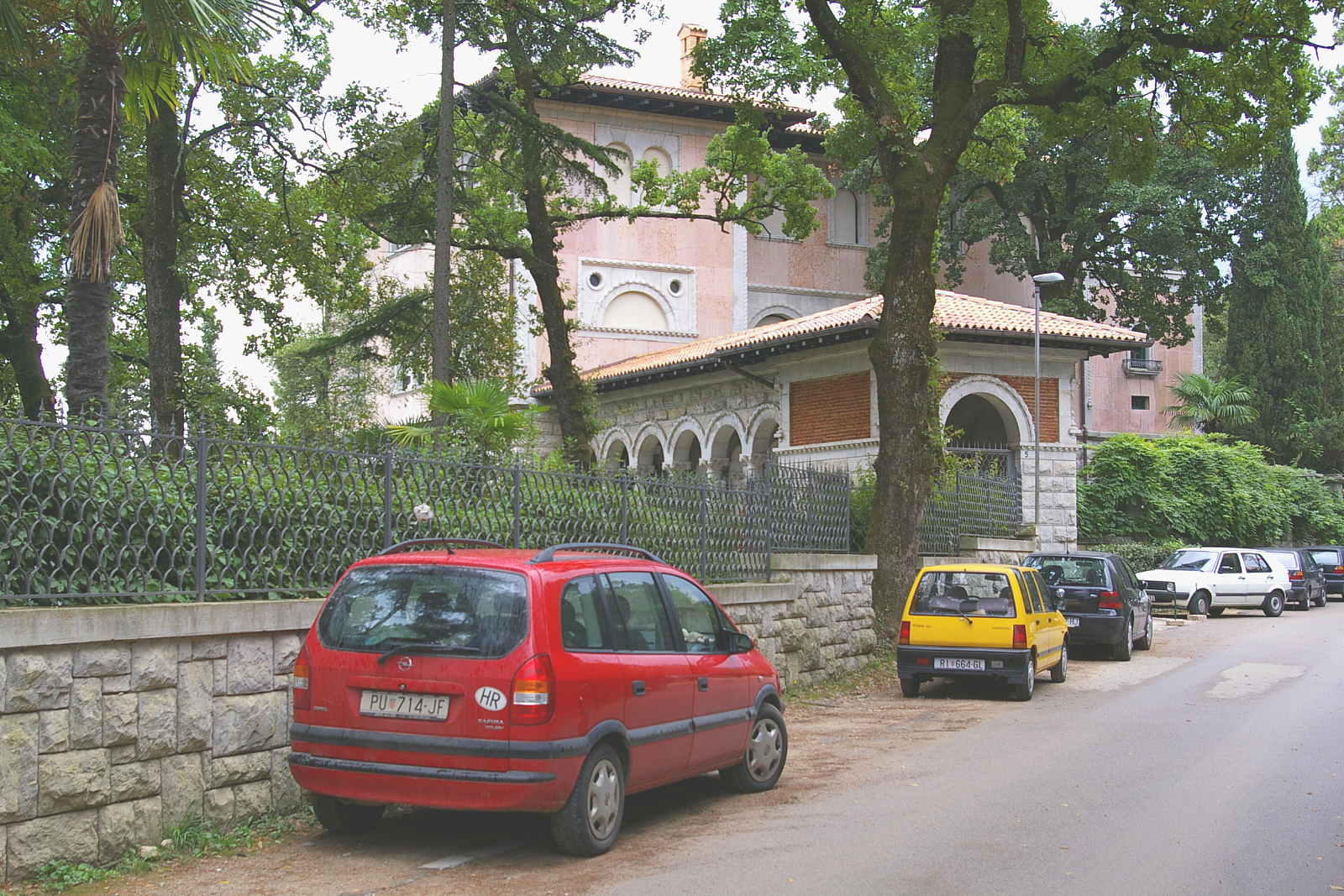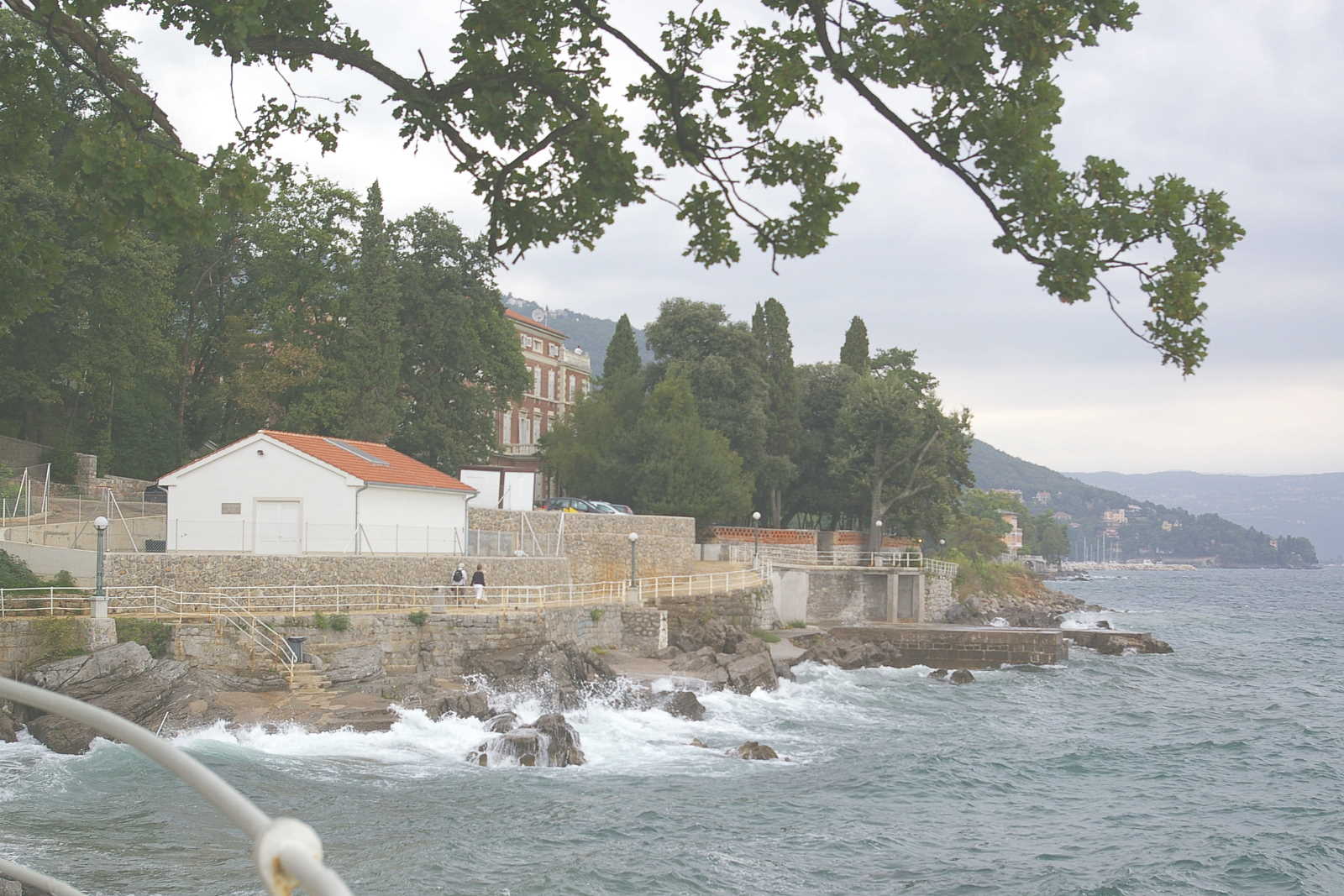 Nördlich der Klinik folgte ich einer nahe der Küste verlaufenden Seitenstraße, an der zahlreiche ältere Villen stehen, und kehrte dann über die Lungomare genannte Uferpromenade zur Altstadt von Lovran zurück. Unterwegs entstand eine Anzahl von Mono- und Stereofotos, welche angesichts des Wetters einen eher wildromantischen als lauschigen Eindruck hervorrufen, wie die folgende Auswahl veranschaulichen soll: