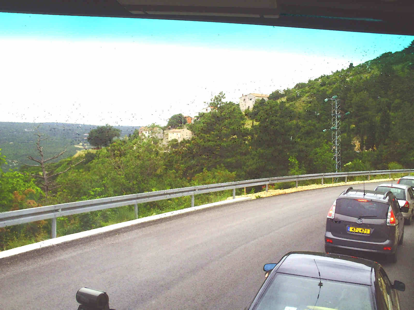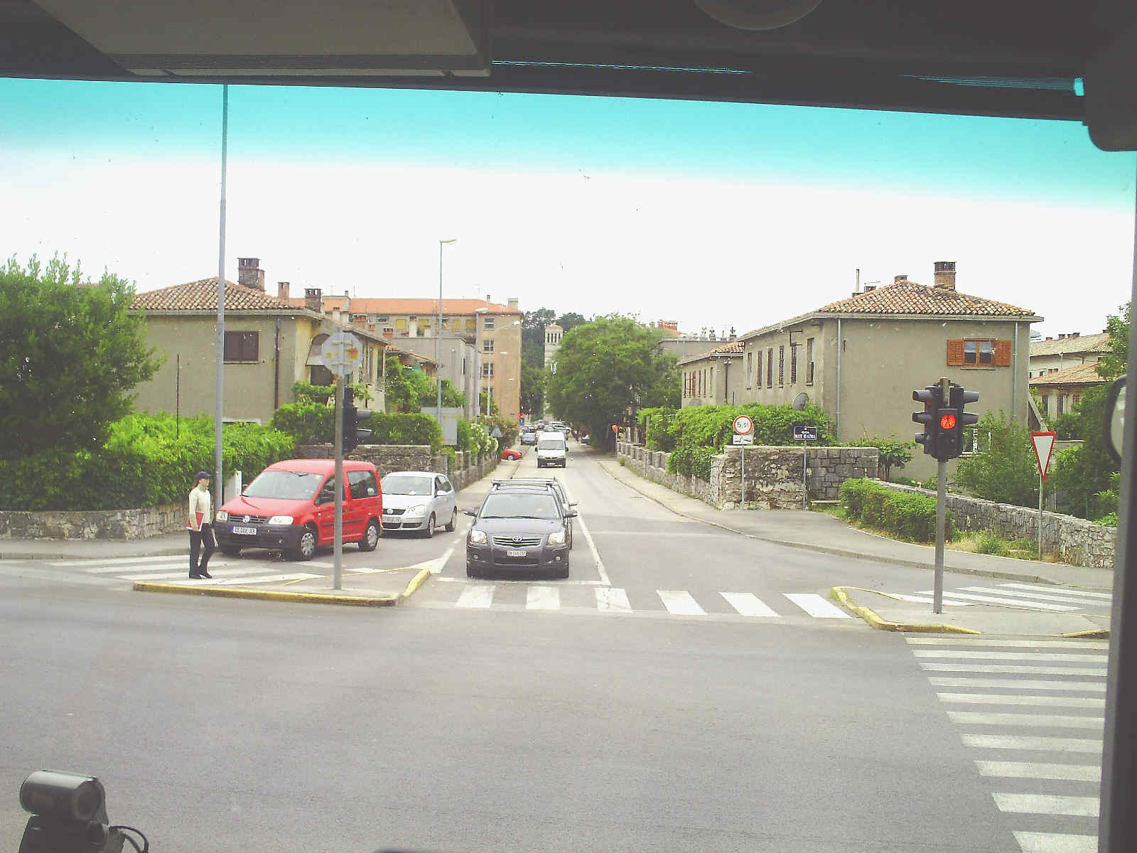 Angesichts des regnerischen Wetters am Morgen hatte ich mich [in Mošćenička Draga (M. D.)] dazu entschlossen, mit dem Bus 10:35 ab Opatija - demnach 10:50 Uhr etwa ab M. D. - nach Pula zu fahren. Das klappte auch vorzüglich [-] abgesehen von den üblichen Baustellen [nunmehr] hinter Zigorje [(richtig: Zagorje) -], wodurch sich die Fahrt verzögerte, so daß ich erst gegen 12:30 Uhr in Pula ankam. Unterwegs Fotos und Videos gemacht, bis der Speicher des Camcorders in die Knie ging, so daß ich einige Filme löschte. [Überlebt haben unter anderem folgende Bilder (die Videos wurden beim Urlaub anno 2010 mit berücksichtigt!): 11:07 Uhr: vor Brseć 11:18 Uhr: zwischen Brseć und Zagorje 11:22 Uhr: Nordzipfel der Insel Cres mit der Schiffsanlegestelle Porozina Detail des Fotos 11:22 Uhr: Motel Vidikovac am Kap Masjnak vor der Bucht von Plomin 11:25 Uhr: erneuerte Hauptstraße entlang der Bucht von Plomin 11:26 Uhr: Blicke über die Straße 21 auf die andere Seite der Bucht von Plomin 11:31 Uhr: Kapelle an der Straße 21 über der Bucht von Plomin 11:35 Uhr: Blick von der Straße 21 unweit des Kraftwerks auf die Bucht von Plomin 11:41 Uhr: Kapelle unweit der E751 an der Zufahrt nach Labin bei Marcilinica 11:46 Uhr: Straßenkreuzung in der Vorstadt der Bergsiedlung Labin 11:48 Uhr: Förderturm der Zeche Tito