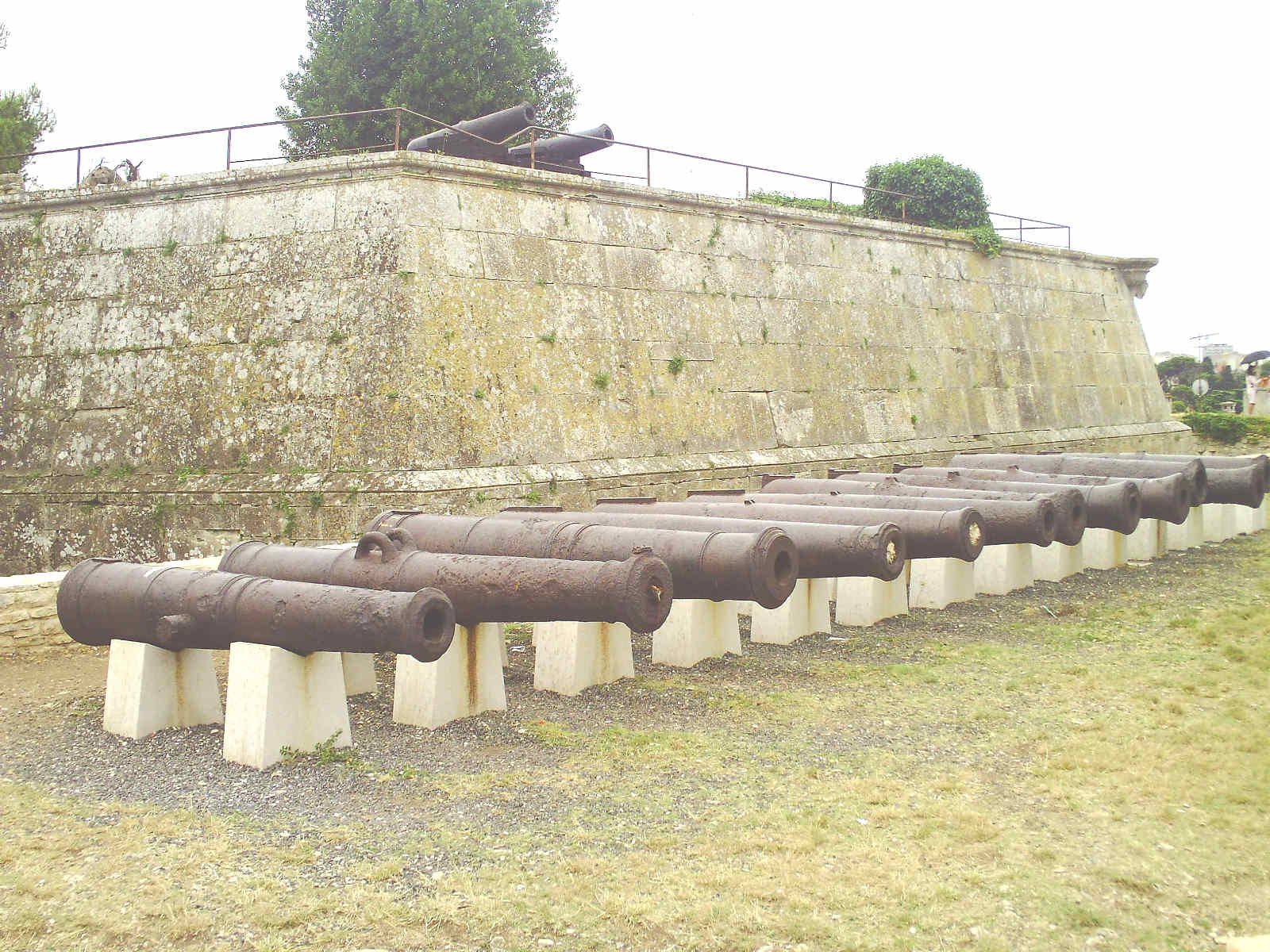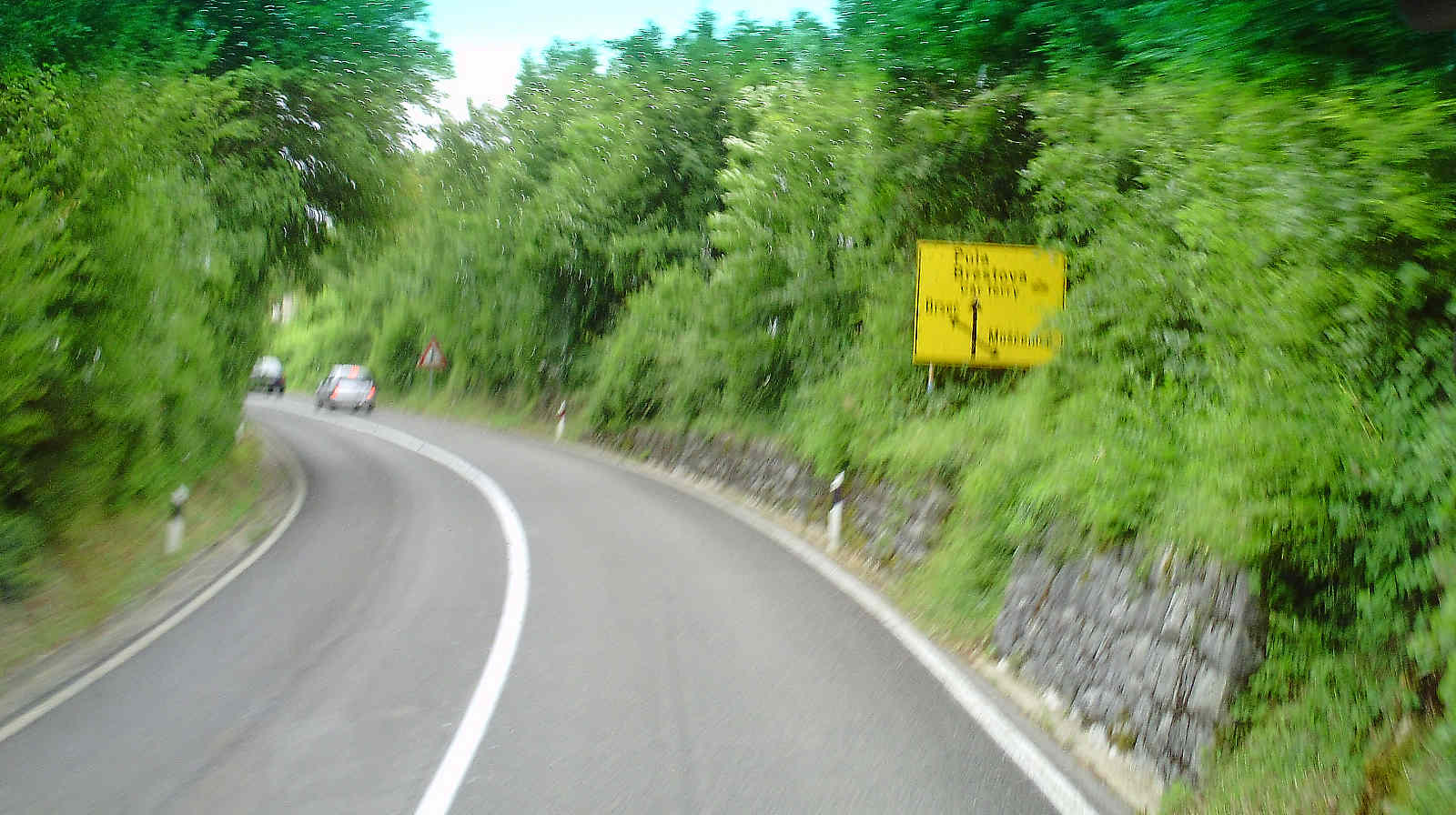 Am Amphitheater hatte ich mein Navigationsgerät [wieder] in Betrieb genommen, welches [dann] treu die Route bis Mošćenička Draga verfolgte. Vom Kastell konnte ich nur wenige Aufnahmen machen, da es stärker zu regnen begann und ich es eilig hatte; daher benutzte ich zuletzt [ausschließlich] den Camcorder, bis dieser aus Speichermangel erneut streikte. [Unter anderem für einen Rundblick auf der Festung vor der Kanonen-Batterie (16:25 Uhr - 6 MB) - hier als YouTube-Video: