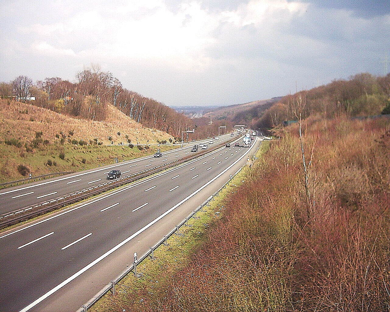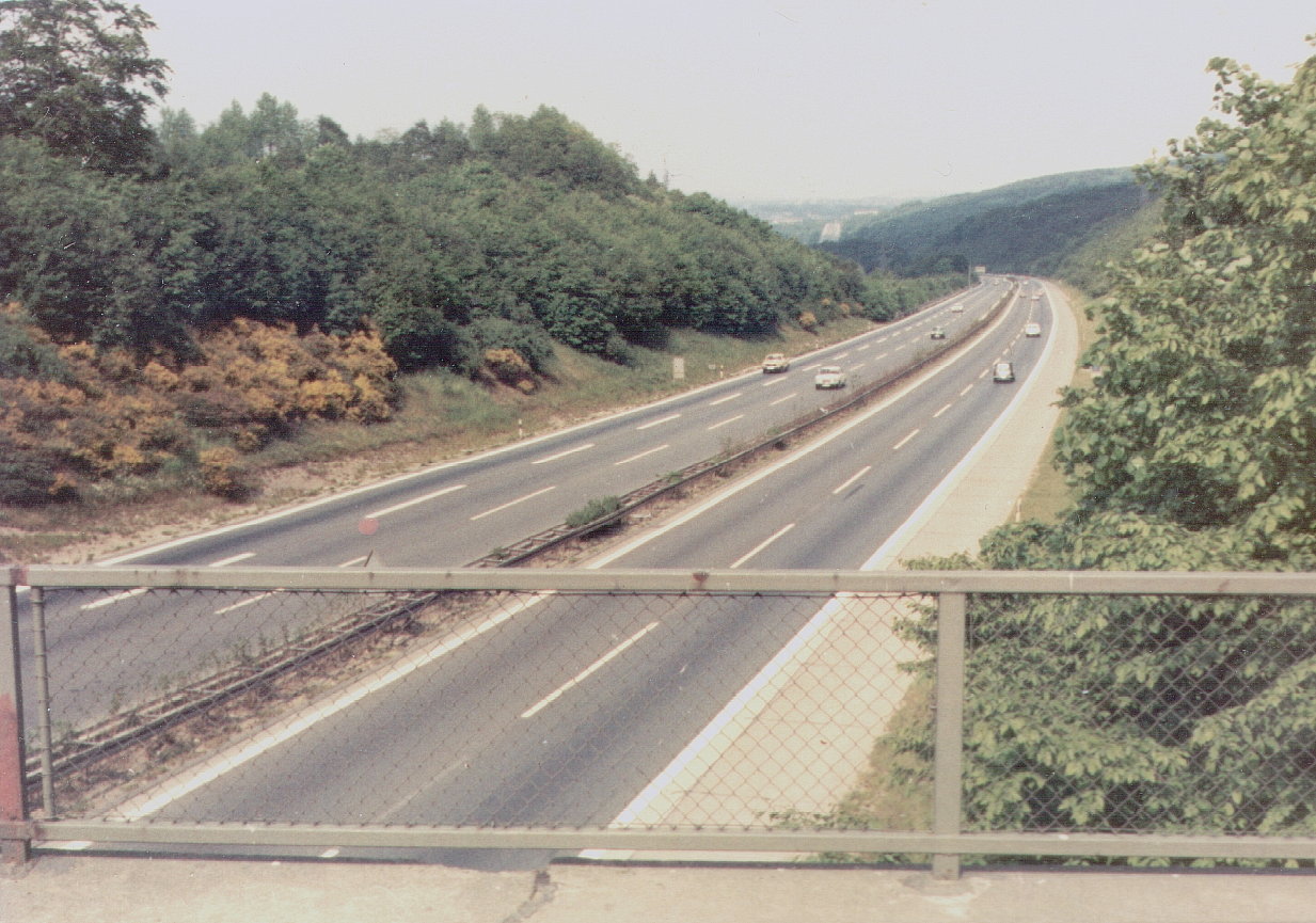 Die Grundschötteler Straße führt seit dem Bau der Fernstraße über die Autobahn BAB 1 hinweg, wobei ich - kurz vor Erreichen der Schlackenhalde - auf meiner Tour vom 31. Mai 1975 ein Foto von der Brücke ostwärts in Richtung Vorhalle schoß: