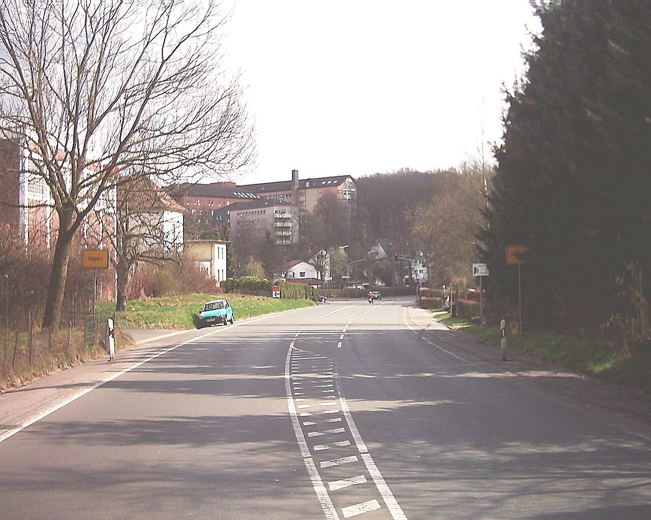 Dieses ließ ich aber - kurz davor angekommen - links liegen, weil die Benutzung des Zufahrtsweges für alle(!) Fahrzeuge untersagt war, und fuhr die Grundschötteler Straße aufwärts, wobei ich zunächst anhielt, um vom Ortsausgang aus ein Foto stadteinwärts zu machen. Dabei liegt im Bildhintergrund links das evangelische Krankenhaus auf der Büddinghardt (bzw. ,am Mops'):