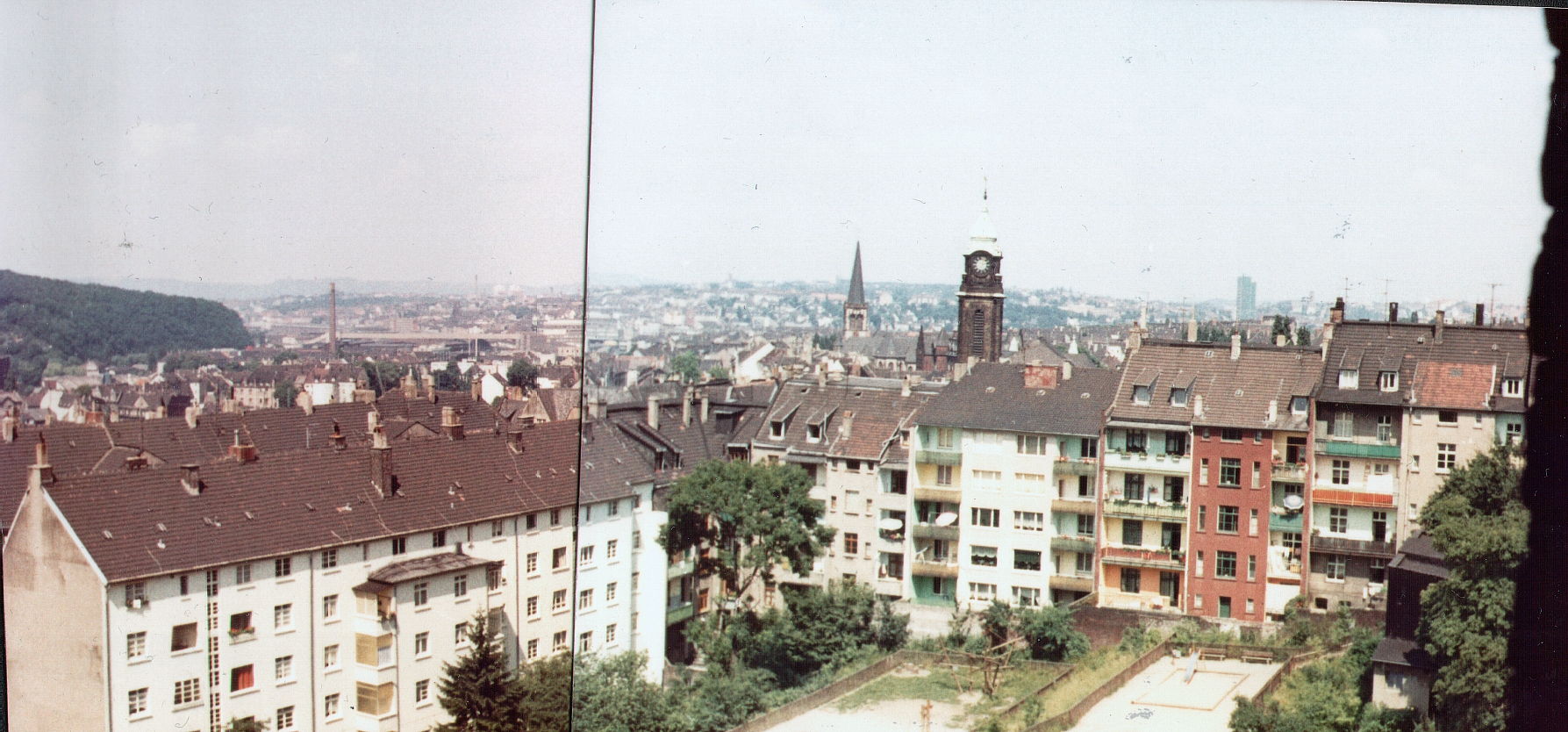 Dieses Foto vom März 1975 wurde auf der Trasse der Kohlenbahn gemacht, deren Schienen freilich bereits 1965/66 entfernt worden waren. Die Autobahnauffahrt an dieser Brücke wurde - wie man hier noch nicht sehen kann - erst viel später gebaut; sie ist auf der zum Vergleich gedachten Ansicht von 2005 allerdings unauffällig: