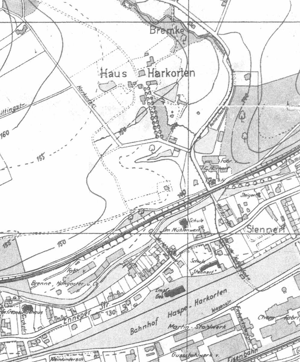 Zum Vergleich der Gegend um Haus Harkorten und die Enneper Straße bei der Kohlenbahn folgt der Ausschnitt eines Plans der damaligen Stadt Haspe (mit eingezeichneten Straßenbauprojekten) aus dem Jahr 1913: